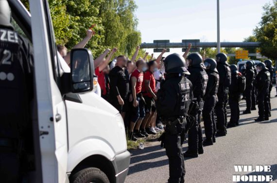 Mitgereiste Fans des 1. FC Köln beim Relegationsrückspiel in Kiel vorm Stadion.