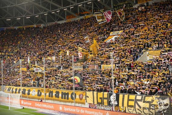 Der mit mehr als 9.000 Dynamo-Fans gefüllte K-Block beim letzten Heimspiel vor gut gefüllten Rängen in Dresden.
