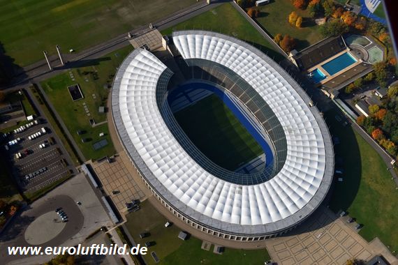 Das Olympiastadion Berlin aus der Luft fotografiert.