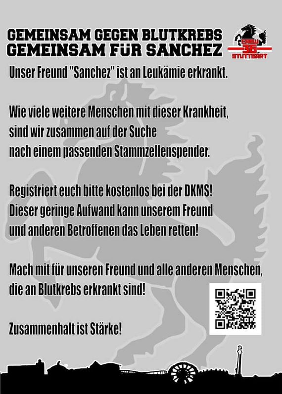 Ein Fan vom VfB Stuttgart ist an Leukämie erkrankt. Die Gruppe Crew 36 ruft deshalb zur kostenlosen Registrierung bei der DKMS auf. Nur wer registriert ist, kann als Spender oder Spenderin in Frage kommen und so das Leben von „Sanchez“ oder anderen Menschen retten. (Faszination Fankurve, 16.07.2021)