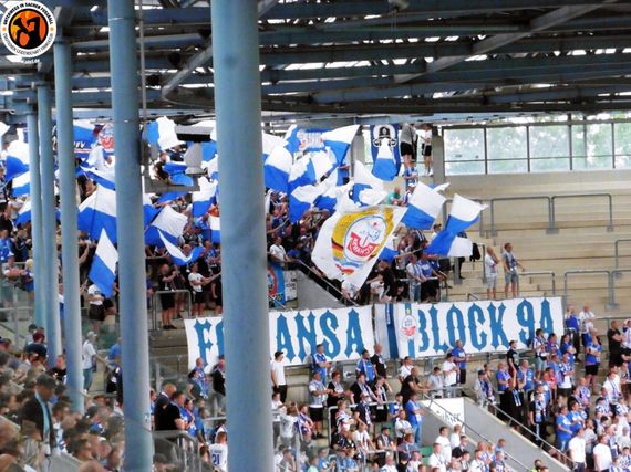 Beim Auftaktheimspiel vom FC Hansa Rostock kamen am gestrigen Samstag 14.500 Fans ins Ostseestadion. Sowohl auf der Südtribüne Rostock, als auch im gegenüberliegenden Block 9A gab es während des Spiels gegen den Karlsruher SC organisierten Support der FC Hansa-Fans.