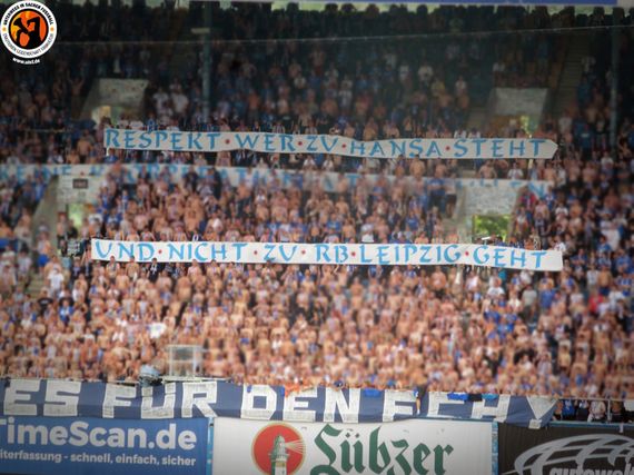 Die aktive Fanszene des Karlsruher SC verzichtete auf die Reise an die Ostsee. Auf der Südtribüne gab es hinter der „ALLES FÜR DEN FCH!“-Fahne hingegen mit Trommel und Vorsänger organisierten Support. Die auf die gegenüberliegende Seite abgewanderten Hansa-Fans schwenkten zudem blau-weiße Fahnen hinter einem „FC HANSA BLOCK 9A“-Banner.