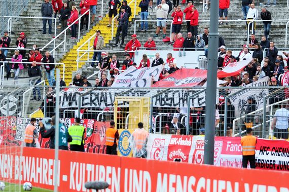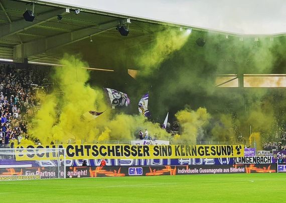 Ultras vom FC Erzgebirge Aue leiteten das heutige Heimspiel im Erzgebirgsstadion mit einer Pyroaktion ein, die unter dem Motto „Schachtscheißer sind kerngesund“ stand. Dahinter zündeten die Fans hinter der „BSG Wismut Aue“-Zaunfahne gelben und schwarzen Rauch.