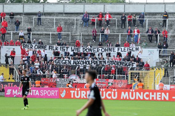 Lediglich Zaunfahnen, sowie zwei Megafone und zwei Trommeln waren genehmigt. Ultras vom Halleschen FC brachten die eigentlich verbotenen Materialien trotzdem mit und machten mit einem eingeschmuggelten „Materialverbote abschaffen“-Spruchband sowie ebenfalls nicht genehmigten Schwenkfahnen auf die Verbote für Gästefans aufmerksam. Mit einem „Bier ohne Alk ist wie Döner ohne Fleisch – Gegen alkoholfreien Stadionsuff“-Spruchband drückten die mitgereisten HFC-Fans zudem noch ihren Unmut darüber aus, dass es im Stadion in München kein Bier mit Alkohol gab. Auf dem Rasen ging Türkgücü mit 2:0 in Führung. Den Gästen aus Sachsen-Anhalt gelang jedoch noch der Ausgleich zum 2:2 Endstand vor etwa 800 Fans. (Faszination Fankurve, 01.08.2021)