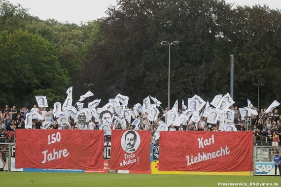 Mehr war am Freitagabend auf den Rängen beim Regionalliga Nordost-Duell zwischen dem SV Babelsberg 03 und der BSG Chemie Leipzig los. In der Nordkurve Babelsberg war eine „150 Jahre Karl Liebknecht“-Choreografie zu bestaunen und im Gästeblock zündeten die mitgereisten Fans hinter einem „CHEMIE LEIPZIG“-Banner Pyrotechnik. Die Gäste aus Leipzig-Leutzsch gewannen im Karl-Liebknecht-Stadion in Potsdam-Babelsberg mit 2:0. Beim Feiern des Auswärtssieges brannte im Gästebereich erneut Pyrotechnik. Hier gibt es alle Fotos der SV Babelsberg 03-Fans von Freitag und hier die Bilder der BSG Chemie Leipzig-Fans.