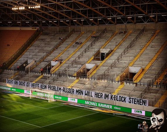 Das Zweitligaduell zwischen Dynamo Dresden und Hannover 96 sahen am Samstagmittag 13.780 Fans im Rudolf-Harbig-Stadion. In Dresden wurden Maßnahmen zuletzt strenger umgesetzt als in anderen Städten in Sachsen, was von der Dynamo-Fanszene bereits mehrfach kritisiert wurde. Vorm nun noch weniger gefüllten K-Block hing deshalb gestern ein „Dicht an dicht ist heute kein Problem – außer man will hier im K-Block stehen!“-Spruchband. Die aktive Dynamo-Fanszene wich auf andere Stadionbereiche aus. Hier geht es zu den Fotos der Dynamo-Fans vom Heimspiel gegen Hannover.