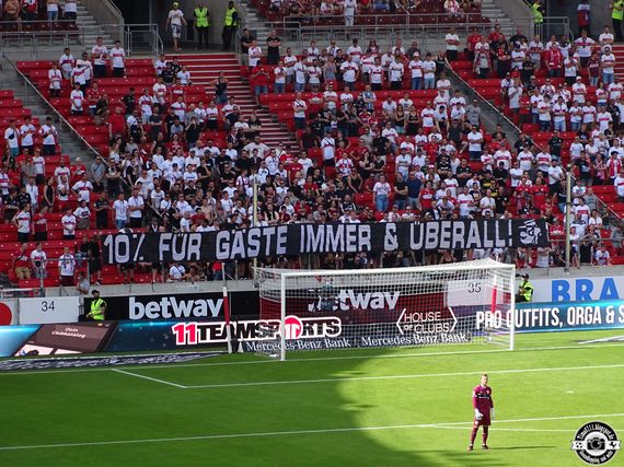 Für die Spielvereinigung Fürth begann die Rückkehr in die 1. Bundesliga mit einem Auswärtsspiel im Neckarstadion beim VfB Stuttgart. Sowohl in der Cannstatter Kurve, als auch im Gästeblock waren Ultras des jeweiligen Vereins anzutreffen. In beiden Kurven gab es jedoch keine organisierte Stimmung, stattdessen jedoch spielbezogenen Support. Die traditionelle Karawane Cannstatt konnte wegen der Pandemie zum ersten Heimspiel dieser Saison nicht stattfinden. Trotzdem zogen Ultras vom VfB in zwei verschiedenen Aufzügen zum Neckarstadion. Innerhalb der Cannstatter Kurve machte lediglich das Commando Cannstatt auf sich aufmerksam. Mit einem „10 % für Gäste immer & überall“-Spruchband sowie u.a. dem „Jeder Verbannte kehrt stärker zurück“-Überhänger trat das Commando Cannstatt gestern im Neckarstadion auch offiziell in Erscheinung. In der Bundesliga dürfen Heimvereine an den ersten beiden Spieltagen komplett auf ein Ticketkontingent für Gästefans verzichten. Danach sind während der Teilzulassungen Ticketkontingente von fünf Prozent aller verfügbaren Eintrittskarten die Mindestanforderungen. In Zeiten vor der Pandemie waren es zehn Prozent aller Tickets. Nach Abpfiff versammelten die Ultras vom VfB Stuttgart noch für ein gemeinsames Foto, um einem an Leukämie erkrankten Mitglied der Crew 36 Mut zuzusprechen. Die Gruppe hatte bereits zum zur kostenlosen Registrierung bei der DKMS aufgerufen (Faszination Fankurve berichtete). Hier gibt es alle Fotos der VfB Stuttgart-Fans von gestern und hier die Bilder der Kleeblatt Fürth-Fans.