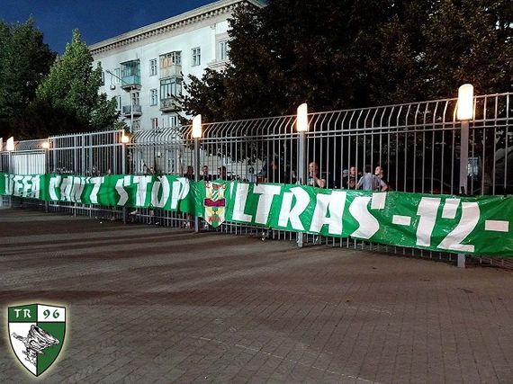 Ultras von Rapid Wien am 26.08.2021 wegen des Gästefanverbots vor Slavutych Arena in der Ukraine.