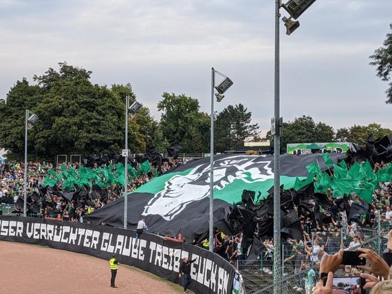 „Unser verrückter Glaube treibt euch an“, lautete das Motto der Choreografie, bei der in der Fiffi-Gerritzen-Kurve eine Blockfahne mit dem Logo von Fede Nerblo, dem neuen Kollektiv der Ultras von Preußen Münster, hochgezogen wurde. Daneben schwenkten Preußen-Fans grüne und schwarze Fahnen, die ein Balkenmuster ergaben.