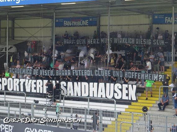 Beim Heimspiel des SV Sandhausen am Samstag gegen Heidenheim beschäftigte sich die heimische Fanszene mit TSG Hoffenheim-Mäzen Dietmar Hopp. 2005 lehnte man beim SV Sandhausen noch eine Fusion mit Hoffenheim und Walldorf ab und behielt als Verein die Eigenständigkeit. Der Kicker machte zuletzt öffentlich, dass TSG-Mäzen Hopp gemeinsam mit Mariano Maroto Lopez Mehrheitsbeteiligungen beim portugiesischen Zweitligisten Academico de Viseu sowie beim brasilianischen Verein Barra Futebol Clube erworben haben soll. Vor allem in der Rhein-Neckar-Region wird immer wieder das Bild von Dietmar Hopp als ein Investor mit starkem Bezug zur heimischen Region gezeichnet. Auf die Engagements in Portugal und Brasilien lässt sich dieses Bild nur schwer übertragen. Für den Einstieg in Brasilien wurde Hopp auch schon aus dem Fanlager der TSG Hoffenheim kritisiert (Faszination Fankurve berichtete). Mit der SV Sandhausen-Fanszene kamen nun die Anhänger des benachbarten Vereins hinzu. „Hopp: Dein Herz muss wirklich riesig sein – Academico de Viseu, Barra Futebol Clube und Hoffenheim?!“, stand am Samstag auf den Plakaten der SV Sandhausen-Fans im Hardtwaldstadion geschrieben.