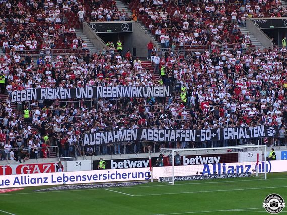 Nachdem das Bundeskartellamt zuletzt auf Wunsch der DFL eine vorläufige Einschätzung zur 50+1-Regel, die im deutschen Profifußball den Einfluss von Investoren begrenzen soll, abgegeben hatte, könnte dies vor allem für Bayer 04 Leverkusen, den VfL Wolfsburg und die TSG Hoffenheim Konsequenzen haben. Diese Clubs machen aktuell von Ausnahmen von der 50+1-Regel Gebrauch. Beim Heimspiel vom VfB Stuttgart gegen Bayer Leverkusen zeigte die Ultras vom Commando Cannstatt in Anspielung auf den bekannten Slogan aus der Arzneimittelwerbung ein „Gegen Risiken und Nebenwirkungen, Ausnahmen abschaffen – 50+1 erhalten!“-Spruchband. Die Ultras vom VfB Stuttgart forderten damit, dass die Ausnahmen der 50+1-Regel endlich abgeschafft werden. Die mit der 50+1-Regel verfolgten Ziele sind laut Auffassung des Bundeskartellamtes nämlich unbedenklich. Für problematisch hielt das Bundeskartellamt jedoch die bisher gültigen Ausnahmeregelungen von der Regel (Faszination Fankurve berichtete).