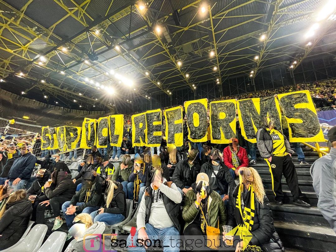 Vorm gestrigen Champions League Heimspiel von Borussia Dortmund protestierten BVB-Fans mit einem riesigen „STOP UCL REFORMS! FOOTBALL FOR MILLIONS OF FANS – NOT BILLIONS OF EURO!“-Plakat (Stoppt UCL-Reformen! FUßball für Millionen Fans – nicht für Millarden Euro!) gegen die im Frühjahr verabschiedete Reform der Champions League.