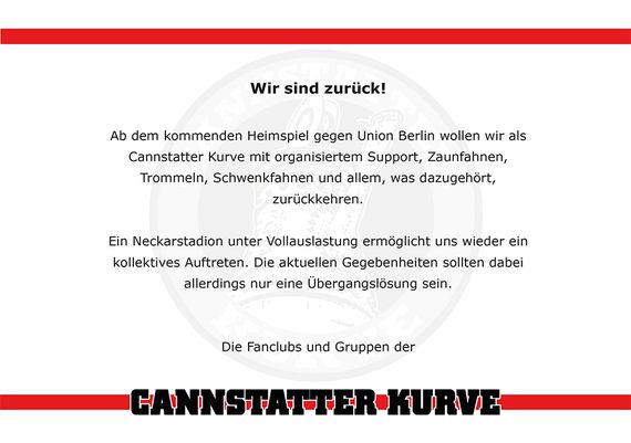 „Ab dem kommenden Heimspiel gegen Union Berlin wollen wir als Cannstatter Kurve mit organisiertem Support, Zaunfahnen, Trommeln, Schwenkfahnen und allem, was dazugehört, zurückkehren. Ein Neckarstadion unter Vollauslastung ermöglicht uns wieder ein kollektives Auftreten. Die aktuellen Gegebenheiten sollten dabei allerdings nur eine Übergangslösung sein“, so das kurze Statement der „Fanclubs und Gruppen der Cannstatter Kurve“, das u.a. auf den Webseiten vom Commando Cannstatt und den Schwabensturm Ultras veröffentlicht wurde.