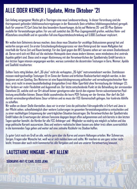 Auch Südkurven-Rat vom FC Carl Zeiss Jena hat im Nachgang der neuen Landesverordnung von Thüringen nochmal ein Statement abgegeben. Im Ernst-Abbe-Sportfeld ist nun ein 3G-Plus-Modell mit 5.000 Zuschauenden möglich. „Wir wollen kein Geheimnis daraus machen, dass die neue Situation für unzählige Diskussionen gesorgt hat und weiterhin sorgen wird. Ein erster Entscheidungsfindungsprozess vor dem Hintergrund der neuen Maßgaben hat innerhalb der Kurve Zeit und Raum benötigt. Für das Spiel gegen den BFC Dynamo sehen wir von einem Stadionbesuch ab. Daran wird sich mit Blick auf die nächsten Heimspiele dann etwas ändern können, wenn mindestens drei zentrale Aspekte geklärt sind.“ Die FCC-Fans wollen, dass es niedrigschwellige und bezahlbare Testmöglichkeiten am Stadion, aber auch in anderen Städten in Thüringen geben wird. Zudem zeigt sich die FCC-Fanszene solidarisch mit Gästefans, denen ebenfalls kostengünstige PCR-Pooltests zur Verfügung stehen sollten. Zudem geht der Südkurven-Rat noch auf Kapazitätsbeschränkungen ein. (Faszination Fankurve, 16.10.2021)