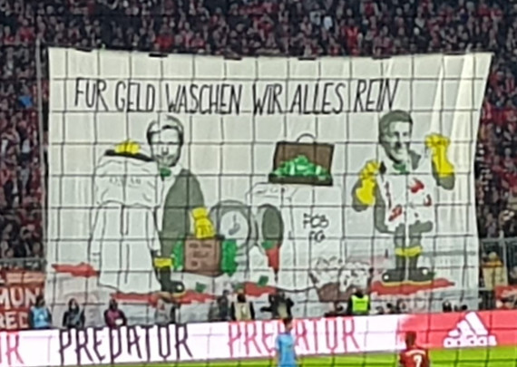 Aktive FC Bayern München-Fans zeigten am Samstagnachmittag beim Heimspiel gegen den SC Freiburg eine Karikatur in der Südkurve München, mit der erneut das Sponsoring-Engagement aus Katar kritisiert wurde. „Für Geld waschen wir alles rein“ lautete das Motto der Aktion.