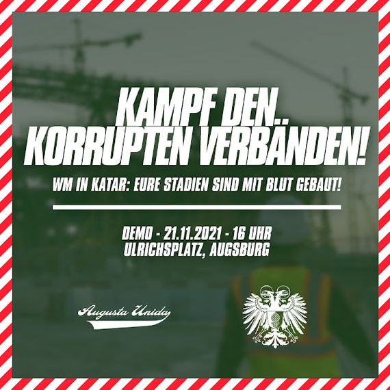 Startpunkt der Demonstration ist am Sonntag um 16:00 Uhr der Ulrichsplatz in Augsburg. Die Kritik der FCA-Ultras richtet sich dabei nicht nur gegen das Gastgeberland Katar und die dortigen Verhältnisse, sondern auch gegen die Fifa, die die WM dorthin vergab und gegen den DFB: „Reformen dürfen nicht nur auf dem Papier existieren! Es muss Druck auf die FIFA und besonders auf die nationalen Fußballverbände ausgeübt werden, damit die Menschenrechtslage verbessert und der Schutz von Arbeitnehmer*innen in Katar garantiert wird. Entscheidungen sollten im Sinne des Sportes getroffen werden. Egal, ob FIFA, UEFA oder der DFB – die Verbände, die ihre Macht noch aus vergangenen Amateursportzeiten innehaben, nutzen diese inzwischen nur noch rein profitorientiert. Sie machen ihr vieles Geld, indem sie das vermarkten – oder, wie im Fall von Katar, verkaufen – was ihnen quasi uneingeschränkt gehört: (inter-)nationale Turniere, ausgetragen von Verbänden und Vereinen, die wiederum hoffen finanziellen Gewinn hieraus zu ziehen. Sie schlagen systematisch und ohne Skrupel Kapital aus einem Sport, der uns allen gehört. Lasst uns gemeinsam ein Zeichen setzen gegen Menschenrechtsverletzungen, Korruption und die Kapitalisierung des Fußballs. Kommt am 21.11.2021 um 16 Uhr zum Ulrichsplatz in Augsburg. Gemeinsam laufen wir durch die Stadt und setzen ein Zeichen für die Einhaltung der Menschenrechte und einen fairen Sport“, heißt es dazu im Demonstrationsaufruf von Legio Augusta und Augusta Unida.
