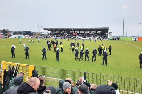 In Velbert kam es beim heutigen Regionalliga West-Spiel zwischen dem KFC Uerdingen und Preußen Münster zu einem umstrittenen Polizeieinsatz. In der Halbzeitpause gerieten Preußen Münster-Fans und die Polizei aneinander. Weil der Polizeieinsatz sich hinzog, dauerte die Halbzeitpause über eine halbe Stunde lang.