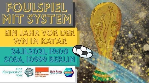Unter dem Titel „Foulspiel mit System: Ein Jahr vor der WM in Katar – Arbeit auf den WM-Baustellen und Solidarität im Fußball“ findet am Mittwoch (24.11.2021) von 19:00 Uhr bis 21:00 Uhr im SO36 in Berlin eine Diskussionsveranstaltung statt, die auch per Livestream übertragen wird.