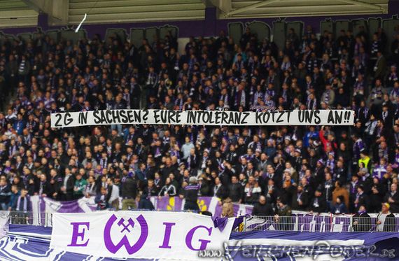 Spruchband von Erzgebirge Aue-Fans gegen Einführung von 2G in den Stadien in Sachsen. Bild: Veilchenpower.de