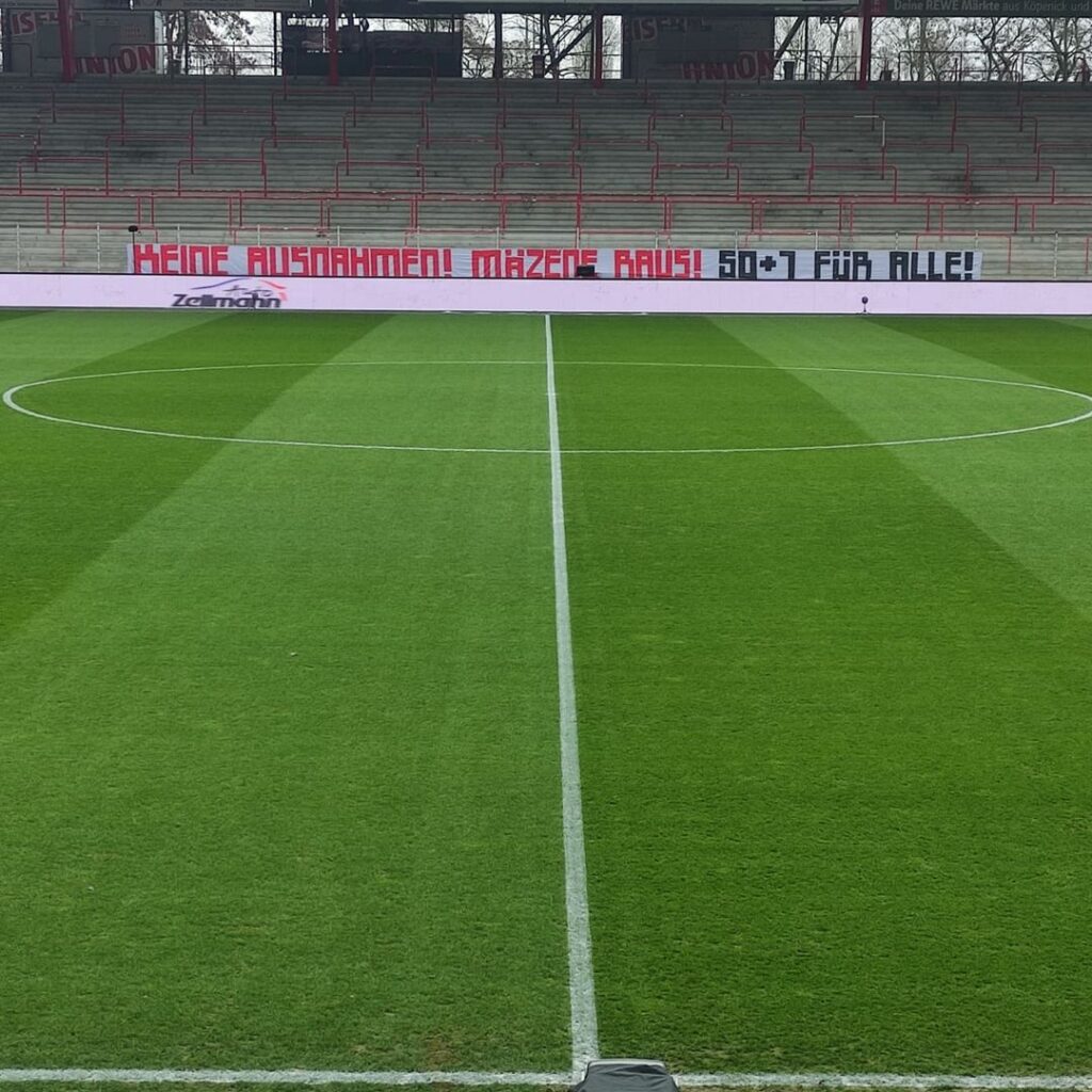 Beim Heimspiel des 1. FC Union Berlin gegen die TSG Hoffenheim setzten die Union-Fans ihre Spruchband-Serie auf der Gegentribüne im Stadion an der Alten Försterei fort. „Keine Ausnahmen! Mäzene raus! 50+1 für alle!“, war auf Höhe der Mittellinie zu lesen. Die Botschaft der Union-Fans, die sich gegen TSG Hoffenheim-Mäzen Dietmar Hopp richtete, war somit auch im Fernsehen deutlich sichtbar. Das Bundeskartellamt hatte im Mai 2021 auf Wunsch der DFL eine vorläufige Einschätzung zur 50+1-Regel, die im deutschen Profifußball den Einfluss von Investoren begrenzen soll, abgegeben. Die mit der 50+1-Regel verfolgten Ziele seien demnach kartellrechtlich unbedenklich. Für problematisch hielt das Bundeskartellamt hingegen die bisher gültigen Ausnahmeregelungen von der 50+1-Regel. Die DFL muss nun eine einheitliche Anwendung und Durchsetzung der 50+1-Regel für alle Vereine gewährleisten. Neben der TSG Hoffenheim machen aktuell auch Bayer 04 Leverkusen und der VfL Wolfsburg von der Ausnahmeregelung Gebrauch. Die Union-Fans forderten gestern, dass die 50+1-Regel zukünftig wieder bei allen Clubs gelten solle. Ein Investor darf laut DFL-Satzung bisher mehr als 50 Prozent der stimmberechtigen Anteile an einer ausgegliederten Profiabteilung halten, wenn er „den Fußballsport des Muttervereins seit mehr als 20 Jahren ununterbrochen und erheblich gefördert hat“.
