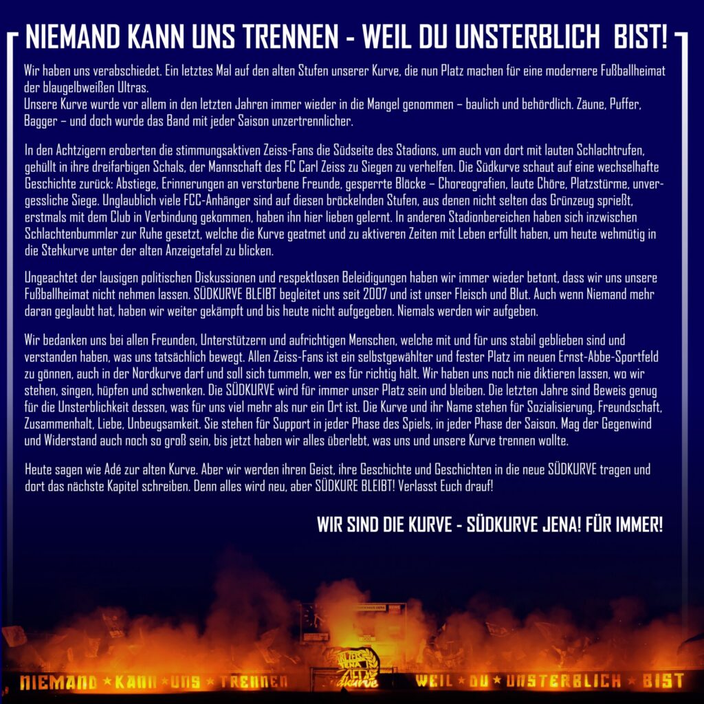 „Wir haben uns verabschiedet. Ein letztes Mal auf den alten Stufen unserer Kurve, die nun Platz machen für eine modernere Fußballheimat der blaugelbweißen Ultras. Unsere Kurve wurde vor allem in den letzten Jahren immer wieder in die Mangel genommen – baulich und behördlich. Zäune, Puffer. Bagger – und doch wurde das Band mit jeder Saison unzertrennlicher. In den Achtzigern eroberten die stimmungsaktiven Zeiss-Fans die Südseite des Stadions, um auch von dort mit lauten Schlachtrufen, gehüllt in ihre dreifarbigen Schals, der Mannschaft des FC Carl Zeiss zu Siegen zu verhelfen. Die Südkurve schaut auf eine wechselhafte Geschichte zurück Abstiege, Erinnerungen an verstorbene Freunde, gesperrte Blöcke – Choreografien, laute Chöre, Platzstürme, unvergessliche Siege. Unglaublich viele FCC-Anhänger sind auf diesen bröckelnden Stufen, aus denen nicht selten das Grünzeug sprießt, erstmals mit dem Club in Verbindung gekommen, haben ihn hier lieben gelernt. In anderen Stadionbereichen haben sich inzwischen Schlachtenbummler zur Ruhe gesetzt, welche die Kurve geatmet und zu aktiveren Zeiten mit Leben erfüllt haben, um heute wehmütig in die Stehkurve unter der alten Anzeigetafel zu blicken. Ungeachtet der lausigen politischen Diskussionen und respektlosen Beleidigungen haben wir immer wieder betont, dass wir uns unsere Fußballheimat nicht nehmen lassen. SÜDKURVE BLEIBT begleitet uns seit 2007 und ist unser Fleisch und Blut. Auch wenn Niemand mehr daran geglaubt hat, haben wir weiter gekämpft und bis heute nicht aufgegeben. Niemals werden wir aufgeben“, kündigte die Horda Azzuro in einem Communiqué an, dass man auch weiterhin für einen Verbleib im Süden des Stadions kämpfen wolle.