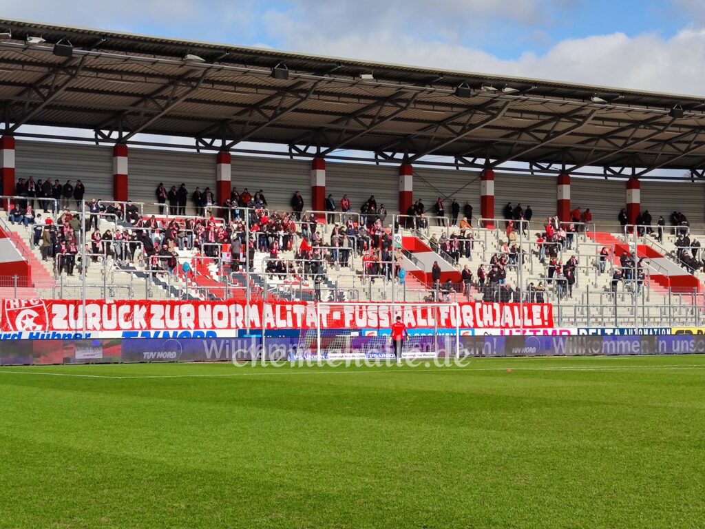 „Am vergangenen Dienstag gab der Ministerpräsident von Sachsen Anhalt die neuen Coronaregeln bekannt. Während jenseits der Grenze unseres Bundeslandes gerade im Bezug auf den Fußball die Lockerungen spürbar sind und man dort auf 3G umgestellt hat, hält man in Sachsen-Anhalt weiterhin an 2G-plus fest. Wie wir bereits zu den letzten beiden Heimspielen am Zaun unsere Botschaft vermittelten muss diese Ausgrenzung nun ein Ende finden! Nach wie vor ist uns der Fußball in Halle nicht als ‚Coronatreiber‘ bekannt, weswegen auch hier mindestens 3G umgesetzt werden sollte. FUSSBALL FÜR (H)ALLE!“, so die Stellungnahme des HFC-Fankurvenrates.