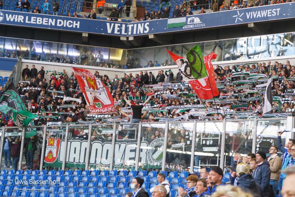 So kam es dann, dass die Ultras des FC Schalke 04 beim heutigen Heimspiel wieder geschlossen auftraten und für organisierte Stimmung in der Nordkurve sorgten. Auch im Gästeblock sorgten die mitgereisten Hannover 96-Fans für laustarken Support. Hinter einer „HANNOVER“-Zaunfahne wurde die Stimmung mit Trommel und Megafon koordiniert. Die Fanszene von Hannover 96 reagierte am Freitag spontan auf die neuen Regeln in Nordrhein-Westfalen und rief intern zur spontanen Fahrt nach Gelsenkirchen auf. Treffpunkt der Hannover 96-Fans war um 07:30 Uhr am Hauptbahnhof in Hannover. Auf Schalke konnten sich die Gästefans an der Tageskarte noch mit Tickets eindecken.