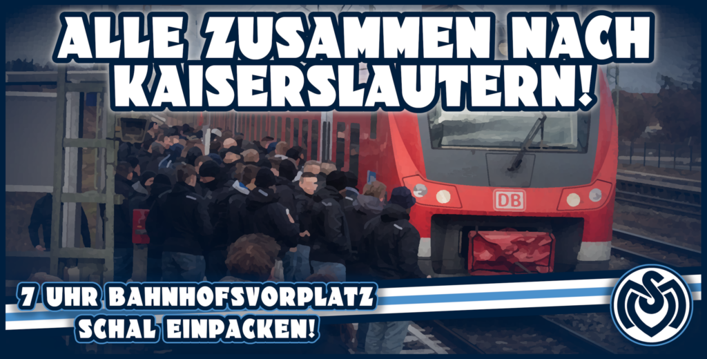 Die FCK-Fanszene trifft sich morgen unter dem Motto „Geh mer nuff uff de Betzeberg“ um 10:30 Uhr am Bahnhofsvorplatz in Kaiserslautern. Zudem werden alle FCK-Fans aufgefordert, morgen Fahnen mit ins Fritz-Walter-Stadion zu bringen, um auch optisch für gute Atmosphäre zu sorgen. Anpfiff auf dem Betze ist um 14:00 Uhr. Bei den Ultras des MSV Duisburg wird ebenfalls für die Drittligapartie in Kaiserslautern mobil gemacht. „Alle zusammen nach Kaiserslautern! 7 Uhr Bahnhofsvorplatz – Schal einpacken“ wird die Zugfahrt in die Pfalz beworben. (Faszination Fankurve, 01.04.2022)