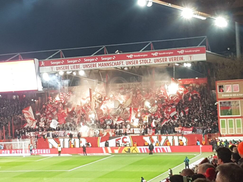 Auf der Waldseite schwenkten die Union-Fans hinter einer großen „1. FUßBALLCLUB UNION BERLIN“-Botschaft ihre Fahnen. Die Ultras zündeten dazu zahlreiche Stroboskope. Ein ähnliches Bild auch im Gästeblock, wo die Kölner Ultraszene erstmals seit Beginn der Corona-Pandemie wieder im Stadion auftrat.