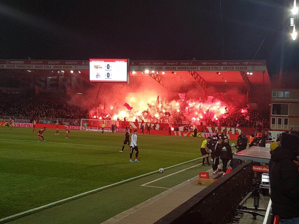 Stimmungsvoll ging es auf beiden Seiten durch die 1. Halbzeit, in der sich beide Mannschaften auf dem Rasen nur wenige Torchancen erspielten. Zu Beginn der 2. Halbzeit zeigten die mitgereisten Kölner Fans erneut eine Pyroshow. Dieses Mal brannten zahlreiche rote Bengalische Fackeln ab. Sowohl auf Union-, als auch auf Kölner Seite wurde zudem während des Spiels immer Mal wieder etwas Pyrotechnik zur Untermalung von Fangesängen eingesetzt.