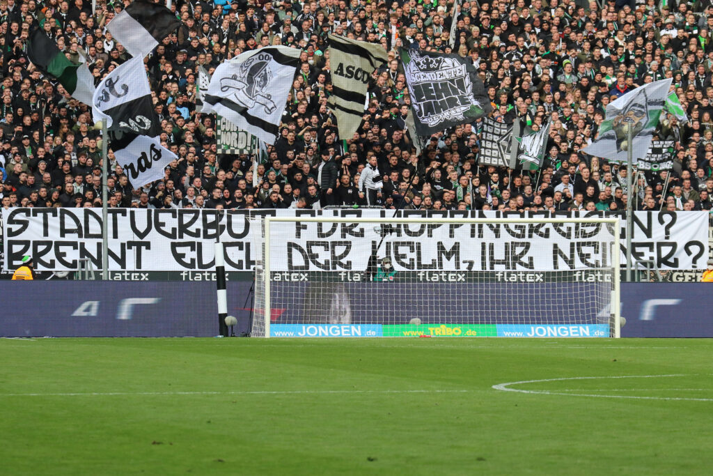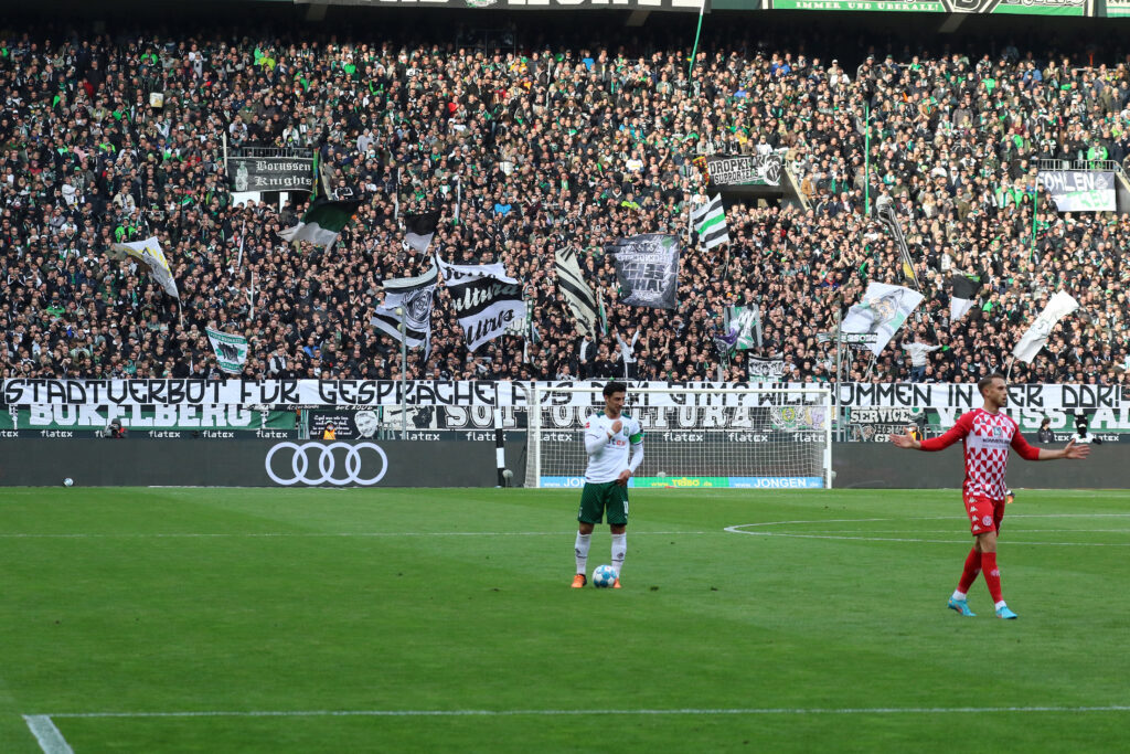 Beim Heimspiel von Borussia Mönchengladbach am Sonntag gegen den 1. FSV Mainz 05 wurden die angedrohten Derby-Betretungsverbote, die für das Stadionumfeld und weitere Teile der Stadt Mönchengladbach gelten, auf mehreren Spruchbändern in der Nordkurve thematisiert. „Die Kurven kehren zurück, die Bullen hyperventilieren – erstmal ein paar Stadtverbote fingieren!“, „Stadtverbot für Gespräche aus dem Gym? Willkommen in der DDR!“ und „Stadtverbot für Hoppingreisen? Brennt euch der Helm, ihr Neider?“ war darauf zu lesen.