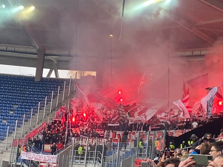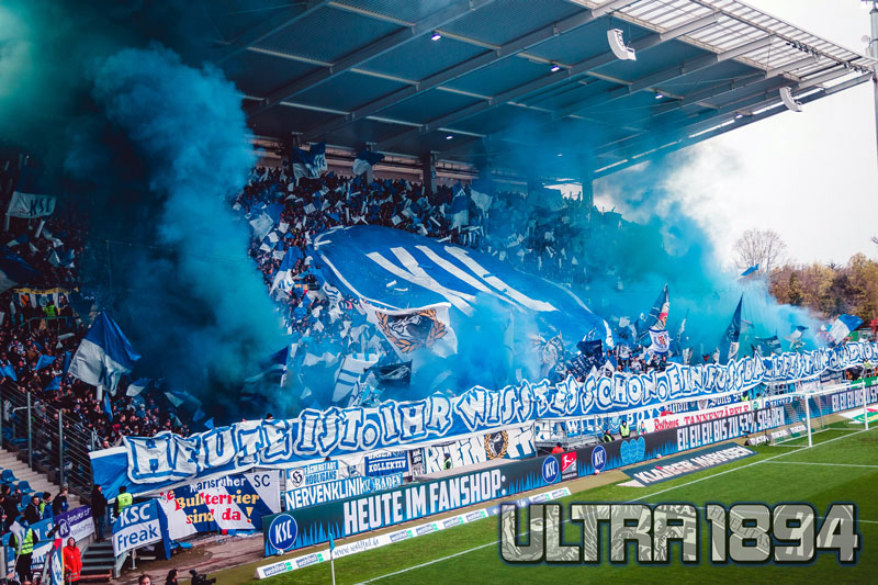 Im Gästeblock der etwa 1.500 Fortuna Düsseldorf-Fans wurde ebenfalls ein mit Pyrotechnik untermaltes Intro gezeigt. Auf dem Rasen trennten sich der KSC und die Fortuna vor 17.907 Fans im Wildparkstadion 2:2. Am Sonntag steht für die aktive KSC-Fanszene dann das Comeback bei einem Auswärtsspiel an: “Ciao Gegengerade, der Sonntag steckt noch in den Knochen, die Erlebnisse aus dem Stadion müssen noch verdaut werden und schon steht das erste Auswärtsspiel seit über zwei Jahren vor der Tür. Überall wo unsere Mindestanforderungen gegeben sind, werden wir wieder am Start sein. Auch in Paderborn ist im Stadion wieder Normalität eingekehrt, also lasst alles stehen und liegen – die Gegengerade fährt nach Paderborn! Wenn ihr euch bisher noch keinem der bekannten Busse angeschlossen habt, organisiert euch in Autos oder 9-Sitzern und lasst uns auch Auswärts wieder für Furore sorgen. Forza Karlsruh‘!”, so die “Die Gegengerade fährt wieder auswärts!”-Ankündigung des ULTRA1894-Bündnis. (Faszination Fankurve, 07.04.2022)