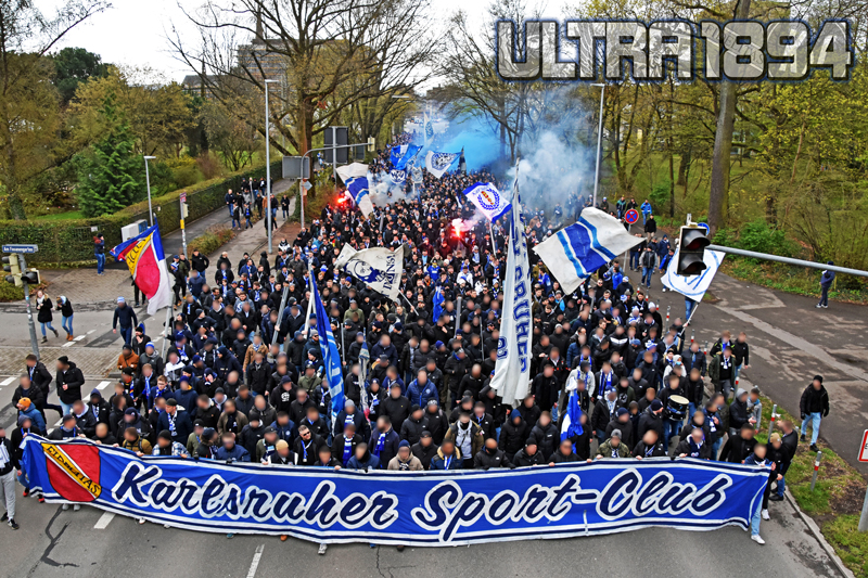 Zuvor zogen die KSC-Fans, wie angekündigt, unter dem Slogan „Zamme nausdabbe – Fußballfest im Stadion!“ vom Marktplatz zum Wildparkstadion. Hinter der Karlsruher Sport-Club-Zaunfahne wurde sich dabei bereits für das anstehende Zweitligaspiel eingestimmt. „Versammelten wir uns zuletzt noch auf einer provisorischen Hintertortribüne, hat sich innerhalb dieser Zeit einiges geändert und so kehren wir nun zurück auf eine Tribüne, auf der 10.000 KSC-Fans Platz haben“, erklärten die KSC-Ultras im Vorfeld des Spiels, warum das Düsseldorf-Heimspiel in doppelter Hinsicht eine Besonderheit mit sich brachte.