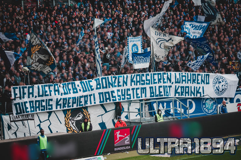 Auf der neuen Gegengerade Karlsruhe wurde am Sonntag noch Spruchbänder gezeigt. „Fifa, Uefa, DFB: Die Bonzen kassieren, während die Basis krepiert! Das System bleibt krank!“ und „Fußball lebt durch seine Fans!“ war auf den Plakaten der KSC-Fanszene zu lesen.
