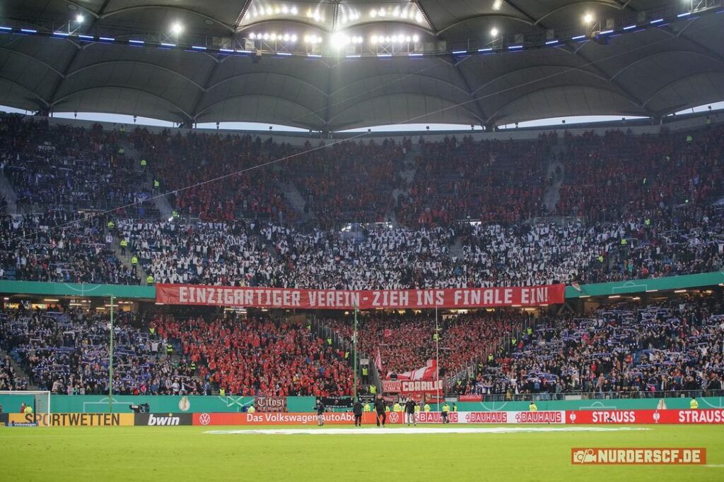 Am Dienstagabend wurde im Volksparkstadion das Halbfinale im DFB-Pokal zwischen dem Hamburger SV und dem SC Freiburg ausgespielt. Auf der Nordtribüne wurde die Partie mit einer Choreografie eingeleitet, im Gästeblock mit einer Pyroshow.
