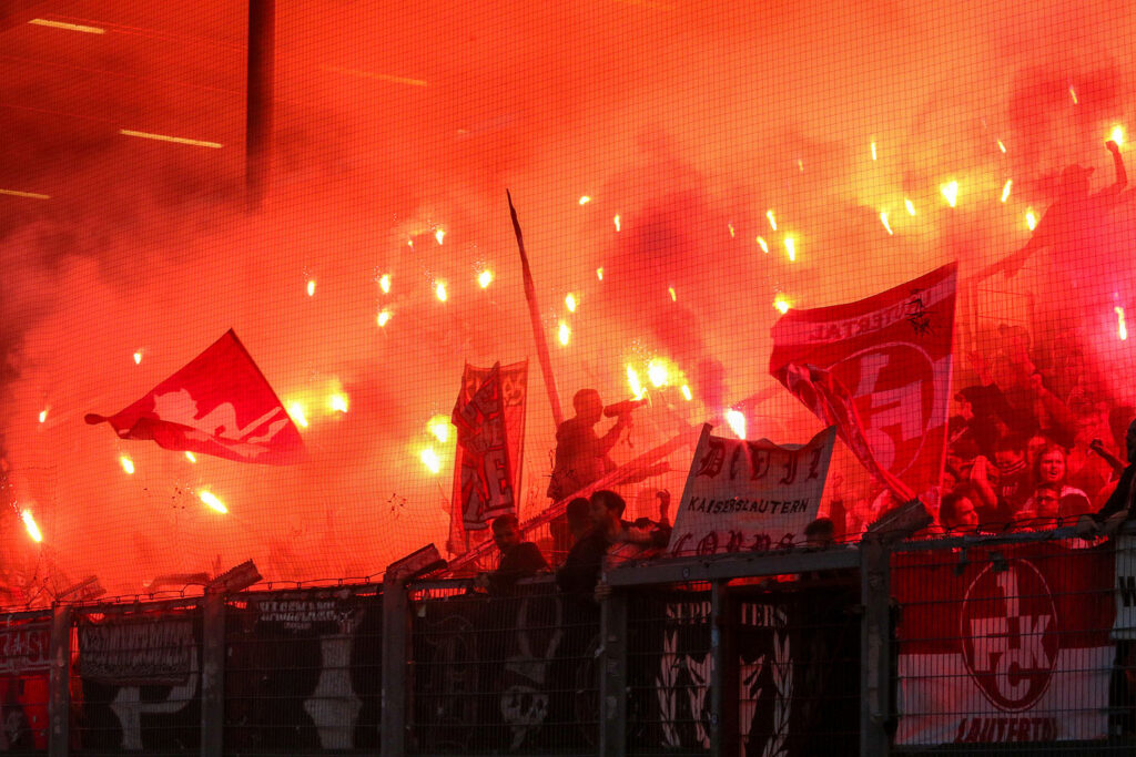 „Endspurt heißt Siege erzwingen“, lautete vor Anpfiff die Botschaft der FCK-Fans vorm eigentlichen Gästeblock. Später wurde der Gästeblock von den FCK-Ultras noch mit roten Bengalischen Fackeln hell erleuchtet.