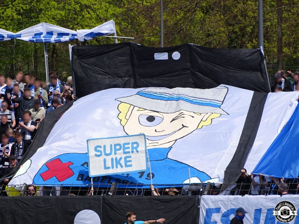 Das Filmstadt Inferno leitete die Partie in der Nordkurve Babelsberg mit einer Choreografie ein. Angelehnt an eine bekannte Dating-App wurden erst Fans von anderen Ost-Verein, wie Energie Cottbus, dem Chemnitzer FC oder Lokomotive Leipzig weggewischt. Bei „Noah, 19 Jahre, Babelsberg 03“ wischte die Hand hingegen nach rechts und verteilte ein „SUPER LIKE“. Mit einer „Du bist meine große Liebe und du wirst es immer sein“-Botschaft wurde die Choreografie eingebettet.