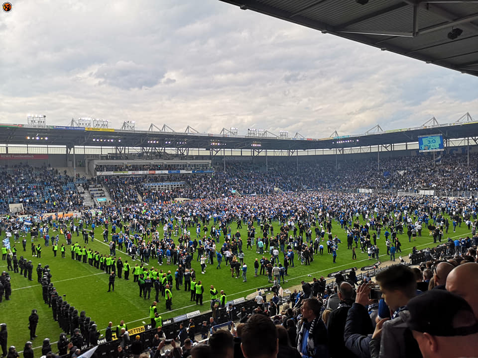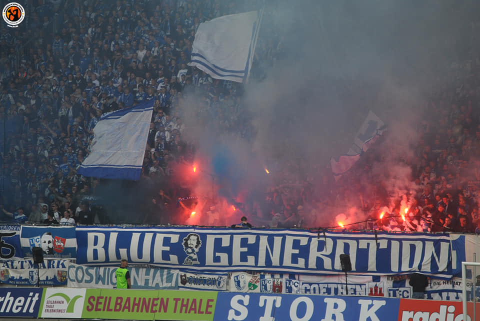 Nach Abpfiff feierten die FCM-Fans die Rückkehr ihres Vereins in die 2. Bundesliga. Die FCM-Fans zündeten zu diesem Anlass Pyrotechnik und feierten auf dem Rasen. Vereinzelt schauten Magdeburg-Fans auch in der Nähe des Gästeblocks vorbei.