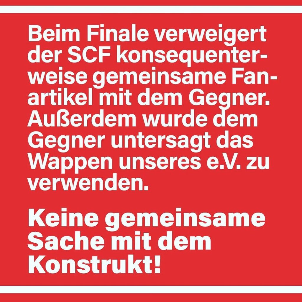 „Beim Finale verweigert der SCF konsequenterweise gemeinsame Fanartikel mit dem Gegner. Außerdem wurde dem Gegner untersagt das Wappen unseres e.V. zu verwenden. Keine gemeinsame Sache mit dem Konstrukt!“, machten die Kollegen von Nordtribuene.org das Vorgehen des SC Freiburg öffentlich. Bei besonderen Spielen, vor allem bei Finalspielen, produzieren Clubs häufig sogenannte Begegnungsschals, die dann Fans beider Vereine als Erinnerung kaufen können.