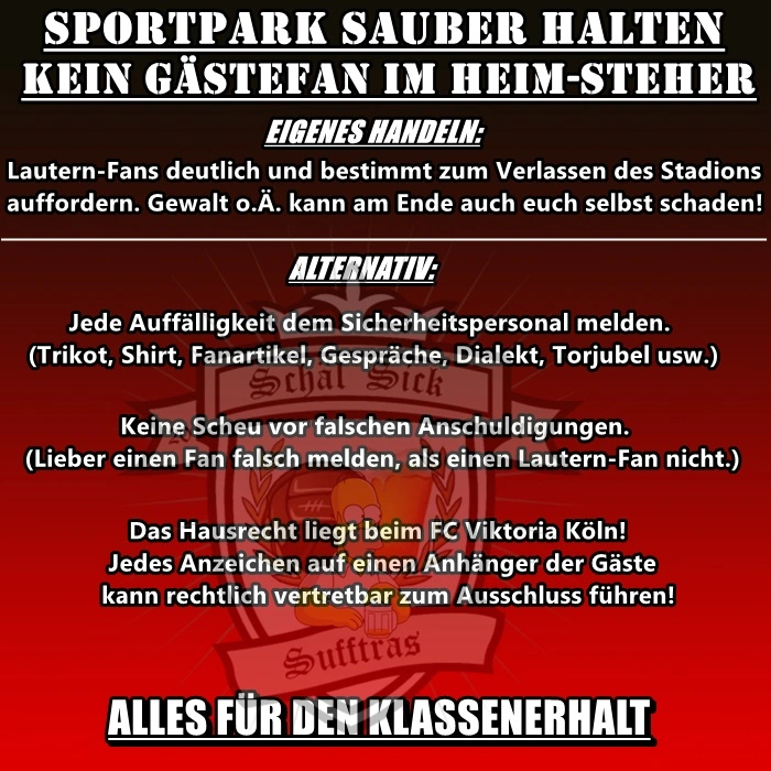 Update: „Wir stehen im Austausch mit dem Verein, mit unserer Fanbeauftragten und anderen Fans. Alle anderen möchten wir ebenfalls durch diesen Appell dazu aufrufen, dabei zu helfen, dass wir es schaffen, möglichst viele Anhänger des 1.FC Kaiserslautern zu identifizieren und dementsprechend schnellstmöglich aus dem Stadion zu entfernen. Im besten Falle können Gästefans schon an den Einlasskontrollen aufgegriffen werden. Für den Fall, dass es dann aber doch Lauterer schaffen, in Block 11 zu gelangen, sind wir alle gefragt! Dies kann über zufällig mitbekommene Gespräche, einen Dialekt von Personen in der Nähe, Shirts, diverse Fanartikel, Torjubel, Fangesänge etc. passieren. Seid aufmerksam und helft mit. Hierzu kann man – wie auf unserem Flyer erwähnt – versuchen, die entsprechenden Personen persönlich aufzufordern, das Stadion zu verlassen. Hierbei raten wir dringend von Handgreiflichkeiten ab, insofern diese nicht in Form von Notwehr geschehen. Damit wird nicht zwingend das Ziel erreicht, Lautrer aus dem Heimbereich zu bekommen, sondern man schadet sich eher noch selbst. Anzeigen, Stadion- oder Hausverbote sind nur wenige Beispiele, die euch als Folge treffen könnten. Wir raten stattdessen dazu, sämtliche Vermutungen unverzüglich einem Ordner zu melden. Diese sind informiert und werden sich darum kümmern. Schreckt auch nicht davor zurück, dass ihr eure Vermutungen äußert, obwohl ihr euch nicht sicher seid. Es ist besser, dass man den Ordner einmal zu oft losschickt und dieser am Ende einen neutralen Fan oder einen Kölner identifiziert, als dass man die Sicherheitskräfte nicht informiert und dafür Anhänger der Gäste im Block bleiben können“, erklären die Schäl Sick Sufftras, dass ihr Aufruf nicht als Aufruf zur Gewalt zu verstehen ist.
