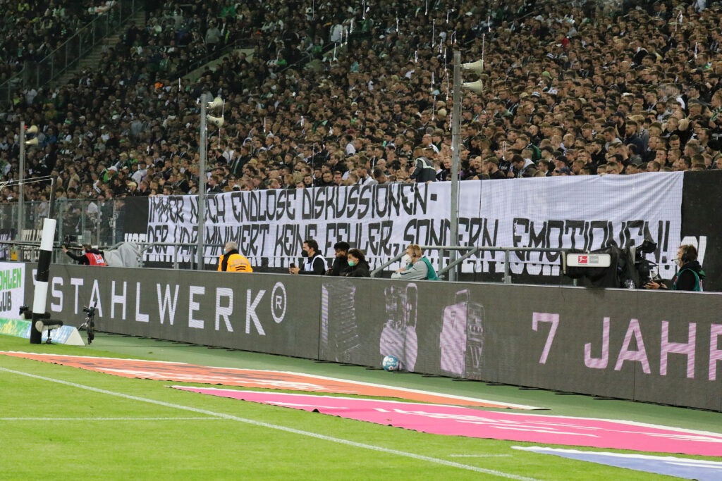 Mit einem „Immer noch endlose Diskussionen – Der VAR minimiert keine Fehler, sondern Emotionen!“-Plakat zeigten die Borussia-Fans am gestrigen Abend nochmal auf, warum der Videobeweis in den aktiven Fanszenen bis heute Verachtung erntet. Beim DFB wurde bis heute verpasst eine einheitliche Linie im Umgang mit diesem Assistenzsystem zu finden, was auch außerhalb der aktiven Fanszenen regelmäßig für Diskussionen um die Sinnhaftigkeit dieser Einführung sorgt.