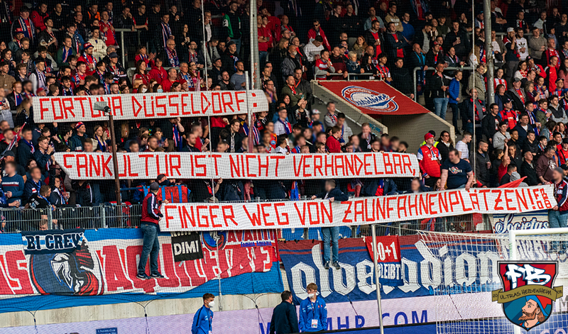 Die Ultras Düsseldorf erklärten zu der Problematik um die Fahne, dass diese seit der Saison 2019/2020 an diesem Platz hänge. Fortuna Düsseldorf habe den eigenen Fans demnach vorab nicht mitgeteilt, dass der Platz nun an einen Sponsor vergeben wurde. Die Ultras wurden laut eigenen Angaben „vollendete Tatsachen gestellt“, weshalb man die Zaunfahne trotzdem an ihrem Stammplatz platzierte. „Nun wurde uns gestern mitgeteilt, dass die Werbebande nicht überhangen werden darf. Die Mitteilung wurde mit der Ankündigung unterstrichen, Ordner abzustellen, die das Fahnenverbot durchsetzen. Ein Angriff auf die Fahnen- und Fankultur der Südtribüne, ist ein Angriff auf uns alle. Der neue Vorstandsvorsitzende Alexander Jobst ist direkt für diese Drohung verantwortlich. Schon seit Monaten bitten wir um ein Gespräch, um die Fahnensituation auf der Südtribüne vor dem Hintergrund eines werbefreien Fanbereichs zu diskutieren und bekräftigten dieses Gesprächsangebot nochmal nach dem letzten Heimspiel – seither werden wir vertröstet. Laut Vereinsangaben geht es um lächerliche 8.000 Euro, die die Werbebande einbringt. Für 8.000 Euro ist die Vereinsführung bereit, notfalls mit Gewalt vorzugehen, um eine Werbefläche vor der Südtribüne durchzusetzen. Marketingaktivitäten in Höhe von 8.000 Euro wiegen für die Verantwortlichen offensichtlich schwerer als das Vereinsbekenntnis zur eigenen Fankultur. Nochmals: Die Fahne hängt seit Jahren an diesem Platz-ohne Probleme. Wir fordern Alexander Jobst auf, endlich auf ein Gespräch einzugehen und wir fordern sein persönliches Bekenntnis zur Fahnen- und Fankultur bei Fortuna Düsseldorf. Wir bitten die verantwortlichen Mitarbeiter von Fortuna Düsseldorf, die die Fanszene seit Jahren kennen, das Fahnenverbot nicht mit Ordnungskräften und/oder Gewalt durchzusetzen. Wir bitten den Aufsichtsrat um Vermittlung und bitten darum, alles dafür zu tun, dass der Verein nicht mit Gewalt gegen seine Fans und Mitglieder vorgeht, um geringfügige finanzielle Interessen durchzusetzen. Um keine Fragen offen zu lassen: Wir gehen gemeinsam, entschlossen und konsequent dagegen vor, sollte jemand an unsere Fahnen gehen“, so die Ankündigung der Ultras Düsseldorf. (Faszination Fankurve, 04.05.2022)