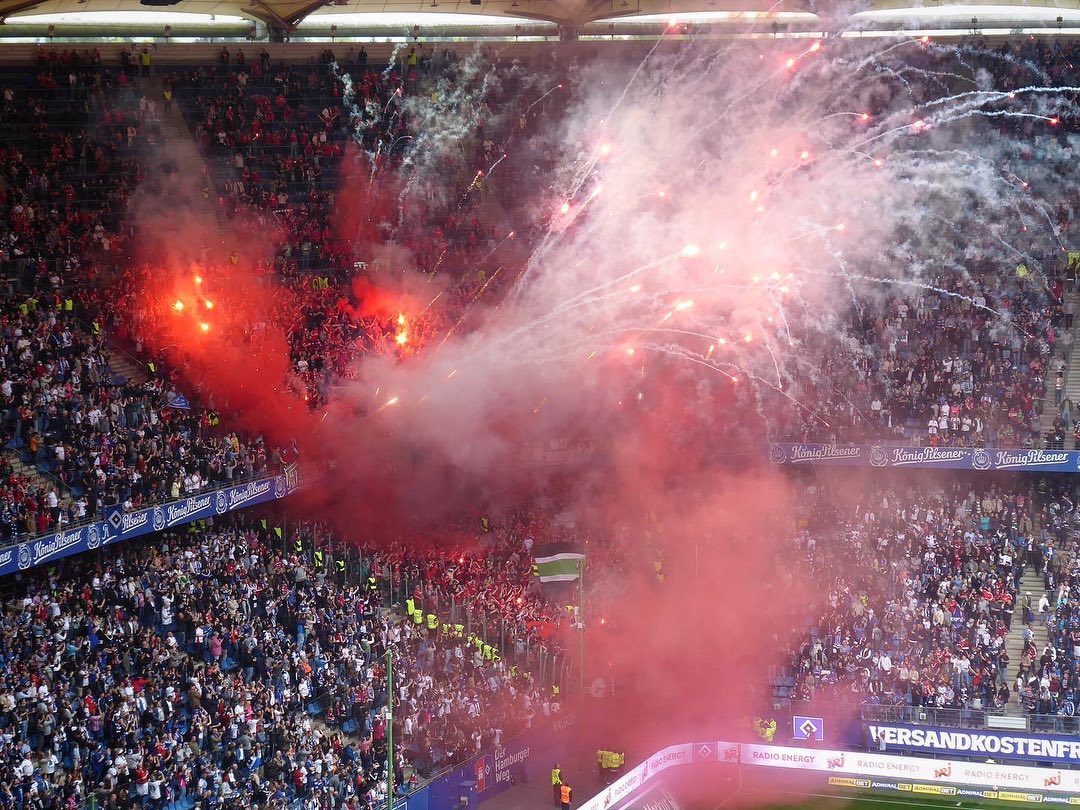 Die Fans von Hannover 96 reisten heute geschlossen in Rot nach Hamburg. Im Gästeblock des Volksparkstadions zündeten die Ultras von Hannover 96 Pyrotechnik und ein Feuerwerk. Das Zweitligaspiel wurde deshalb mit mehreren Minuten Verspätung angepfiffen.