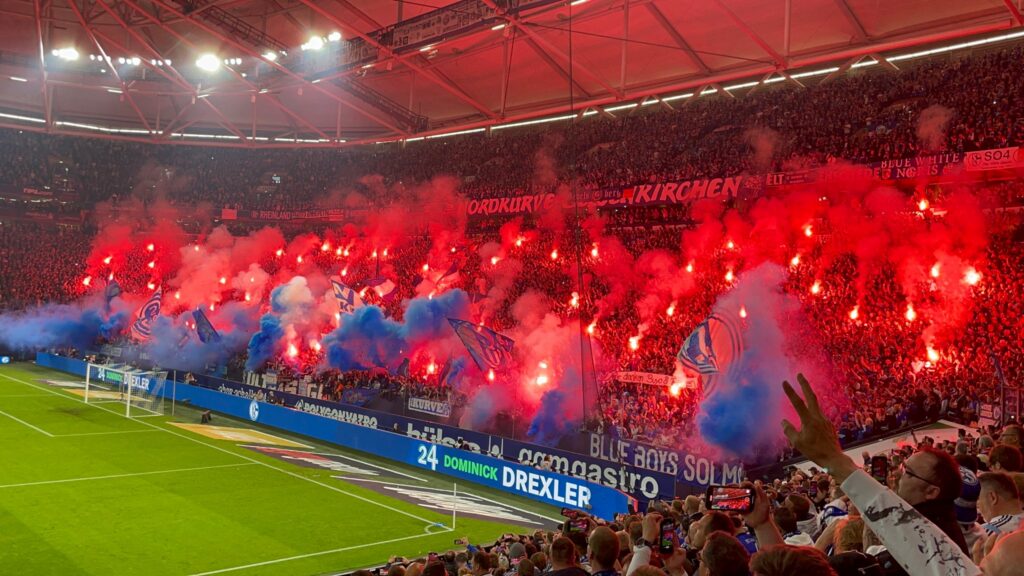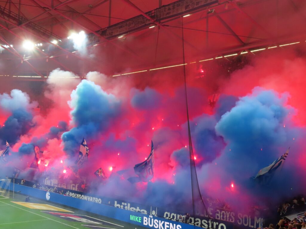 Der FC Schalke 04 hat beim Heimspiel am Samstagabend gegen den FC St. Pauli die Rückkehr in die Bundesliga perfekt gemacht. In der Nordkurve Gelsenkirchen leiteten die Ultras die Partie mit einer großen Pyroshow ein. Rote Bengalische Fackeln und weiß-blauer Rauch nebelten die gesamte Kurve ein.