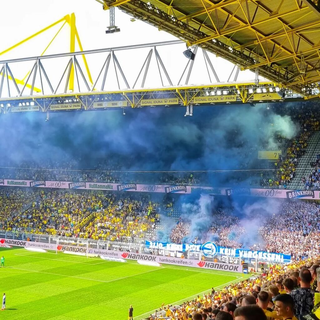 Auf dem Rasen gingen die Gäste aus der Hauptstadt heute vor 80.500 Fans im ausverkauften Westfalenstadion in der 18. Minute durch ein Elfmetertor von Belfodil in Führung. Der Treffer sorgte für Jubel bei den in Trikots gekleideten Gästefans. In der 2. Halbzeit drehte der BVB das Spiel durch ein Elfmetertreffer von Haaland und ein Tor von Moukoko jedoch noch. Durch den gleichzeitigen Sieg des VfB Stuttgart gegen den 1. FC Köln rutschte Hertha BSC am 34. Spieltag der Bundesliga noch auf den Relegationsplatz. (Faszination Fankurve, 14.05.2022)
