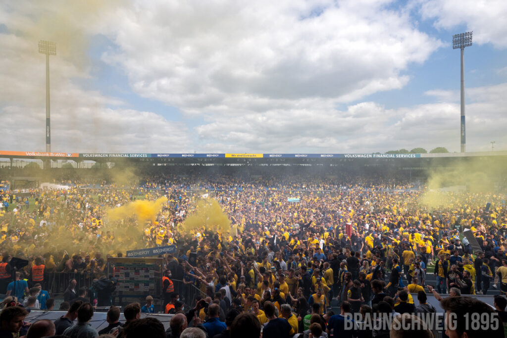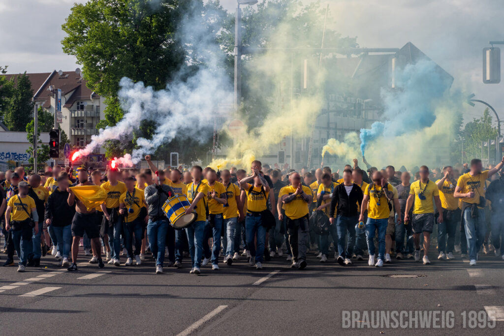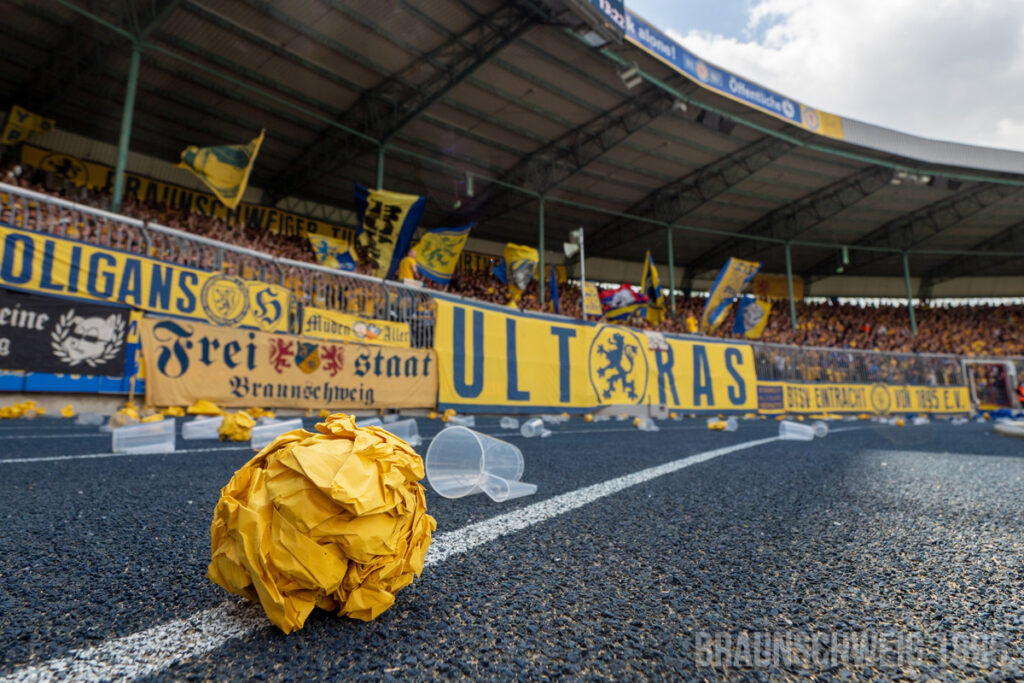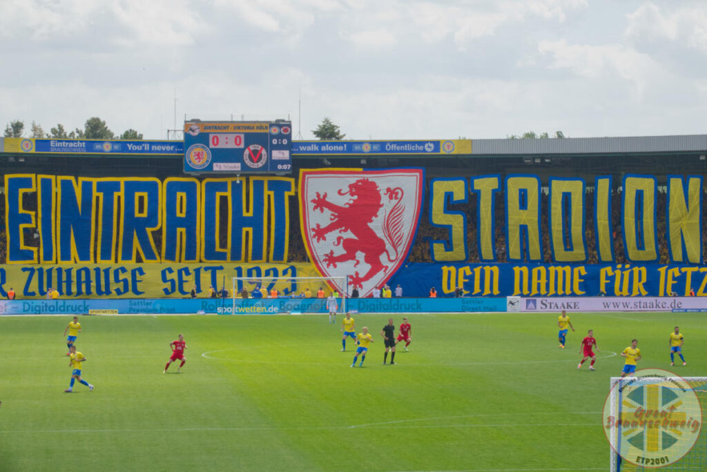 Nachdem Eintracht Braunschweig am 08. Mai 2022 in die 2. Bundesliga aufgestiegen ist, kam es am vergangenen Samstag zum Heimspiel gegen Viktoria Köln. In der Südkurve wurde dabei zum Einlaufen der Mannschaften eine Choreografie präsentiert. In der 2. Halbzeit geriet dort zudem eine Zaunfahne in Brand.