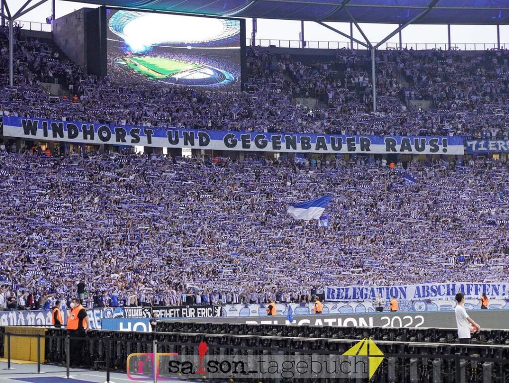 Auf dem Rasen gewann der HSV durch ein Tor von Ludovit Reis in der 57. Spielminute mit 1:0. Reis wollte eigentlich eine Flanke schlagen, die überraschenderweise am Innenpfosten und dann im Tor landete. Nach Abpfiff feierten die mitgereisten HSV-Fans lautstark mit der Mannschaft. Ultras zündeten dabei erneut Pyrotechnik. Die Hertha BSC-Spieler verzichteten hingegen auf einen Gang in die Ostkurve und verschwanden in den Katakomben des Olympiastadions. Am Montag wird um 20:30 Uhr das Relegationsrückspiel im Hamburger Volksparkstadion angepfiffen. Es wird die letzte Möglichkeit für Hertha BSC sein doch noch die Klasse zu halten. (Faszination Fankurve, 20.05.2022)