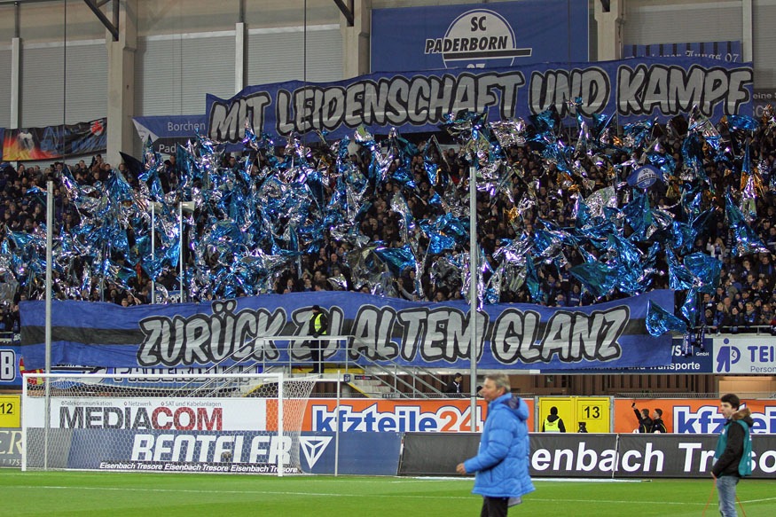 „MIT LEIDENSCHAFT UND KAMPF ZURÜCK ZU ALTEM GLANZ“, lautete das Motto der Choreografie im Gästeblock, bei der schwarze und blaue Zettel verteilt und die HSV-Raute als Blockfahne ausgebreitet wurde. Anschließen kam noch weiße Pyrotechnik zum Vorschein. In den sozialen Netzwerken wurde die gestrige Aktion der HSV thematisiert, weil Anhänger des SC Paderborn am 12. Februar 2016 beim Heimspiel gegen Kaiserslautern eine Choreografie zeigten, bei der ebenfalls der „MIT LEIDENSCHAFT UND KAMPF ZURÜCK ZU ALTEM GLANZ“-Spruch verwendet wurde. Statt auf Papptafeln setzten die SC Paderborn-Fans damals aber auf Glitzerfahnen.