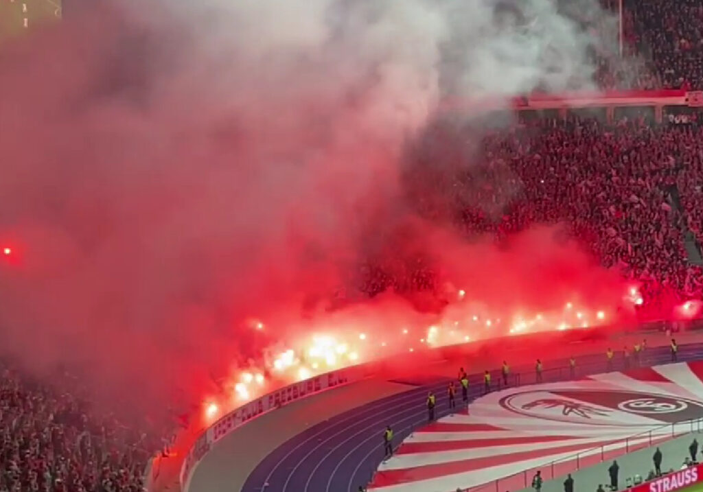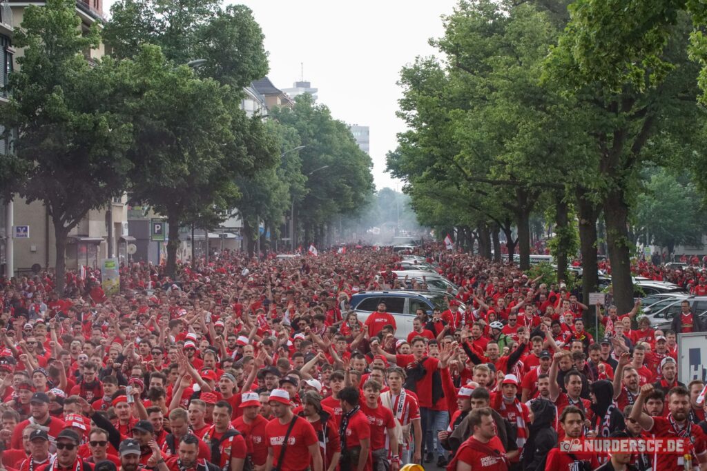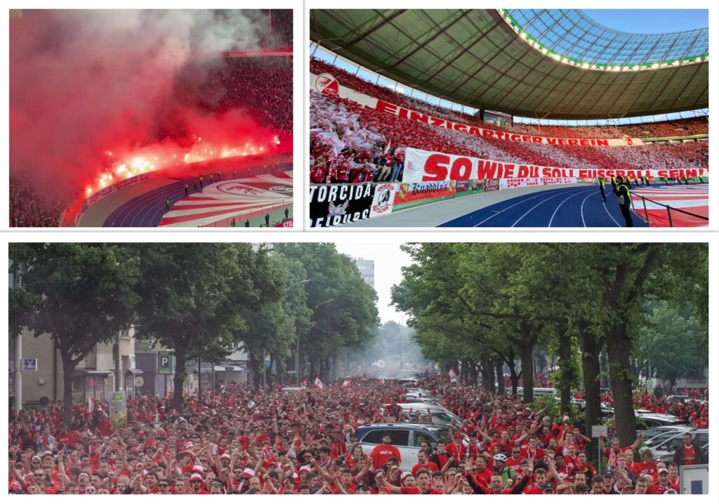 Die in einheitlichen roten “SPORT-CLUB FREIBURG E.V.”-Shirts gekleideten Sportclub-Fans trafen sich am Samstagmittag ab 14:00 Uhr am Theodor-Heuss-Platz in Berlin-Westend und zogen von dort in einem Fanmarsch zur Ostkurve des Olympiastadions, wo um 20:00 Uhr das Finale angepfiffen wurde.