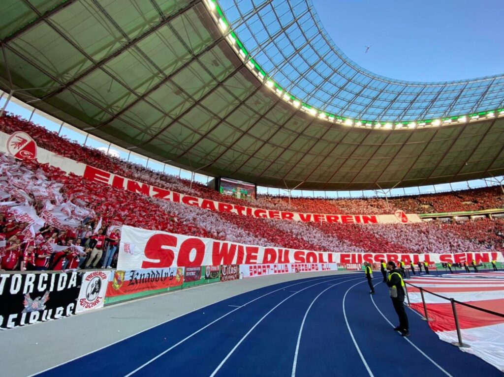 Die Fans des SC Freiburg leiteten das heutige DFB-Pokalfinale mit einer Choreografie ein, die unter dem Motto „Einzigartiger Verein – So wie du soll Fußball sein!“ stand. Die Botschaft betonte dabei die Struktur des SC Freiburg als eingetragenen Verein, richte sich aber indirekt auch gegen das Konstrukt RB Leipzig.
